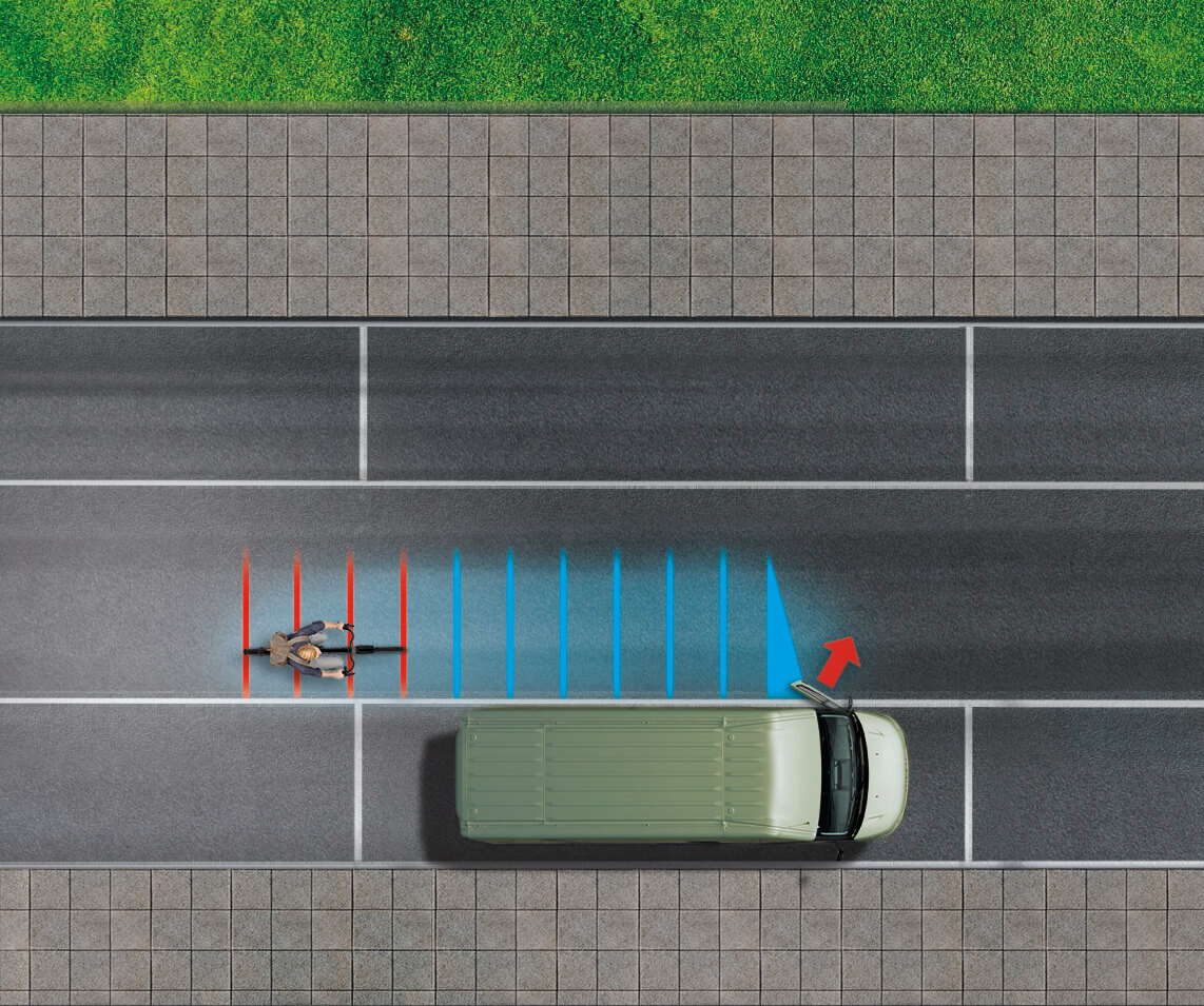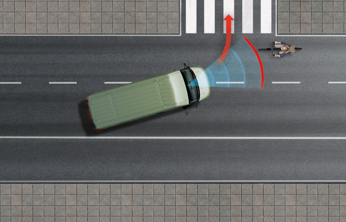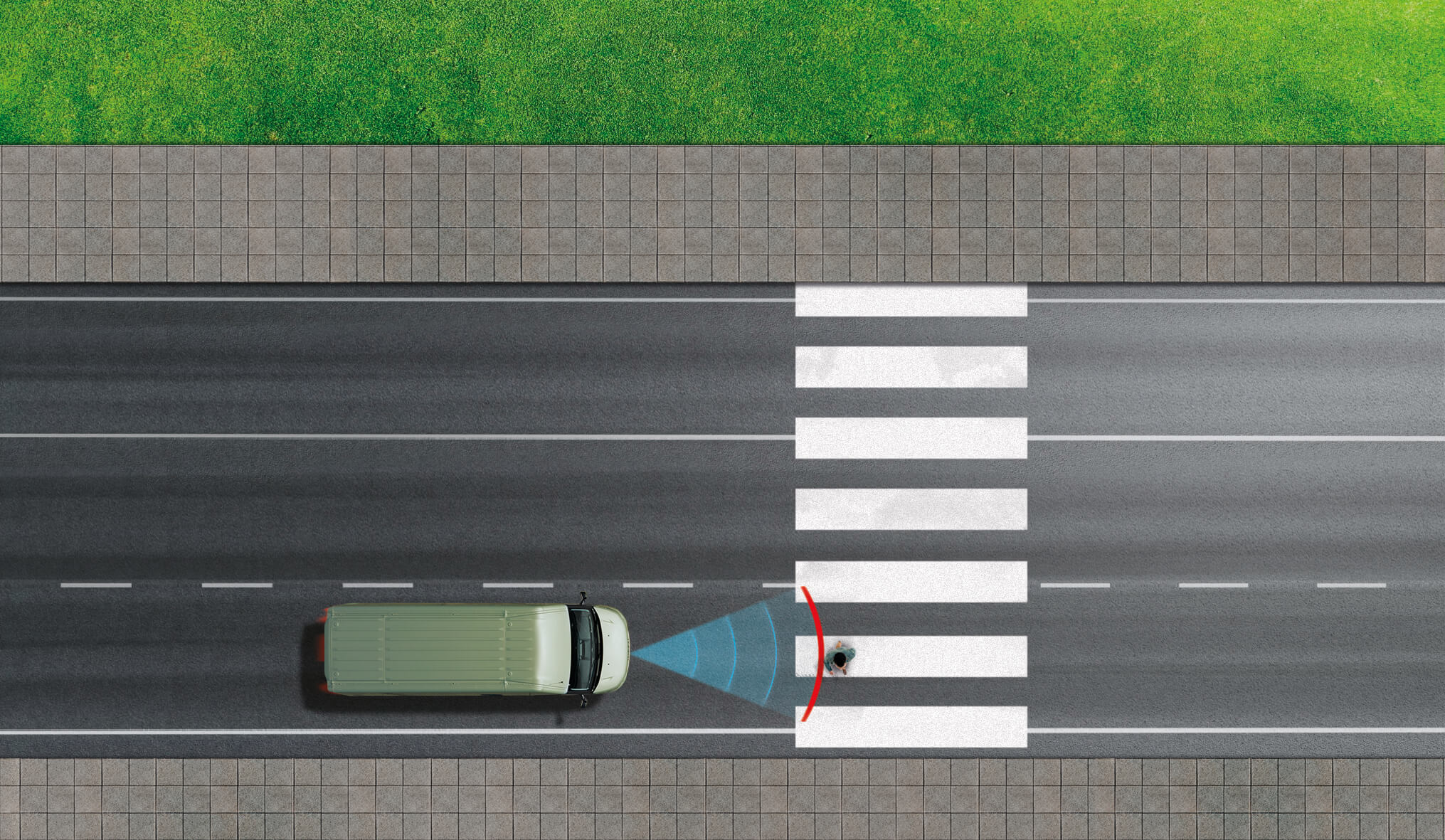 A rendszer felismeri a forgalomba helyezett járműveket és a közlekedés veszélyeztetett résztvevőit, és megakadályozza az ütközést az alacsony sebességgel közlekedő gyalogosokkal és kerékpárosokkal.