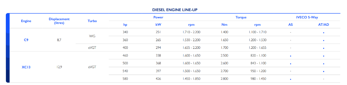 A kínálat az IVECO 8,7 literes C9 NG és az új XCursor 13 12,9 literes motorjait tartalmazza. Az Európai Unió által adott derogációnak köszönhetően a 18 és a 26 tonnás földgázüzemű járművek az önsúlyuknak megfelelő többletsúlyt kaptak. Új, 2x 135 literes és 2x 175 literes CNG-tartályok mindkét oldalon, így akár 780 km is lehet a hatótávolság.