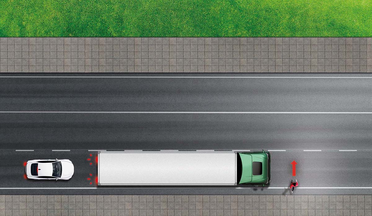 Vizuális és akusztikus jelzést adva figyelmeztet a járda felőli holttérben 5-20 km/h sebességgel közlekedőkre.